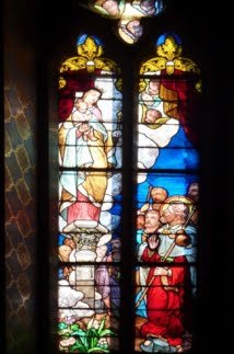 A Saragosse, saint Jacques et ses rares disciples sont encouragés par la Vierge qui leur appararaît (vitrail de l’église Saint-Victor offert par Mr. J. Mauran en 1880-1882) (cl. OT Montesquieu)