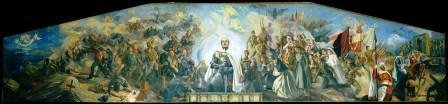 L’illustration choisie comme en-tête de cet article est une peinture murale de Reque Meruvia, qui se trouvait aux Archives générales militaires à Madrid. Peu connue, elle est aujourd’hui au musée des Armées à Avila. Elle date de 1948 et son titre est ALEGORIA DE FRANCO Y LA CRUZADA. Cette allégorie de la guerre civile illustre le lien entre Franco et saint Jacques. Galicien, le général Franco avait une grande dévotion pour saint Jacques qui apparaît ici au-dessus de lui sur son cheval blanc comme à Clavijo.