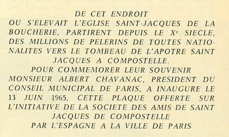 Chacun sait maintenant qu’il n’y a pas eu de millions de pèlerins de Compostelle au Moyen Age et qu’il n’y avait pas de points de rassemblement de pèlerins. La Société française des amis de saint Jacques le croyait encore en 1965 quand elle a fait offrir cette plaque. La connaissance historique a progressé et montré comment les exprits s’étaient enflammés au début du XXe siècle