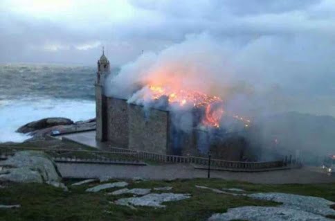 Au petit matin du 25 décembre 2013, l’incendie provoqué par la foudre ravage la sacristie, au premier plan, et l’intérieur de Notre-Dame-de-la-Barque de Muxía
